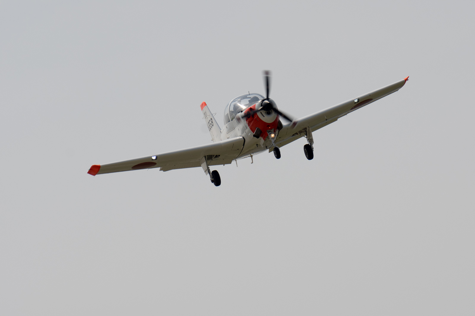 次のフライトに備えて場所をずらしましょうか。ショーセンターより少し東側にずれて、多少なりとも順光寄りになるかなと。そして教官パイロットの駆るT-7が機動飛行。実に軽快に飛んでくれます。